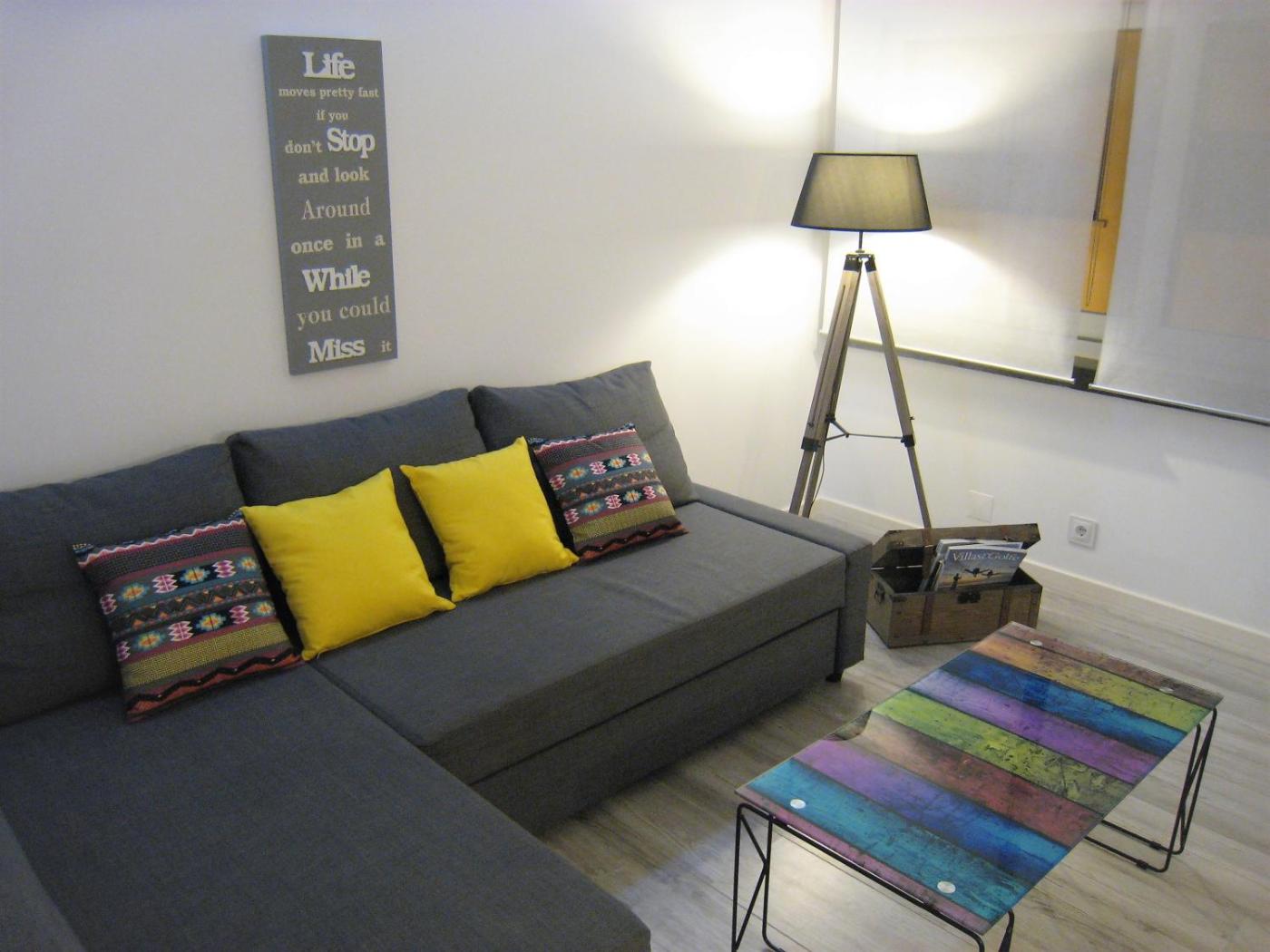 One-Bedroom Apartment. This air-conditioned apartment offers a double bedroom and the bathroom with a shower and hairdryer. It includes a double sofa bed, flat-screen TV with DVD player and dining area in the living room. A hob, toaster, coffee machine, electric kettle, microwave, dishwasher and washing machine are provided in an open-plan kitchen. There is also a city-view balcony with an outdoor table.
